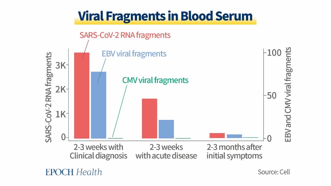 For example, in the journal Cell, scientists published a study that followed around 300 COVID-19 patients and tested their blood serum for viral fragments including from the Epstein-Barr Virus (EBV), the Cytomegalovirus (CMV), as well as SARS-CoV-2 itself.