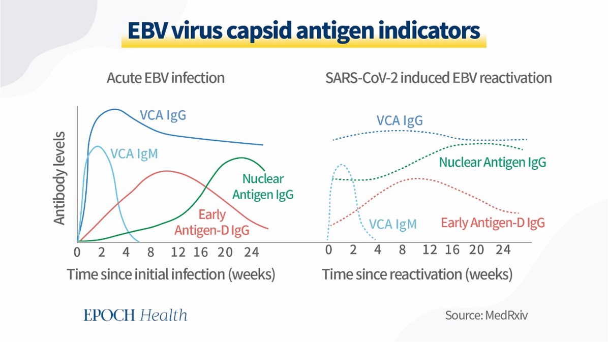 Actually, studies have found that the fluctuation patterns of antiviral IgG levels can indicate whether this is coinfection or reactivation of latent EBV. In the diagram illustrated here, the solid lines represent antigen levels for EBV during acute infection, and the dashed lines are predicted antigen levels for a reactivation of EBV caused by SARS-CoV-2.